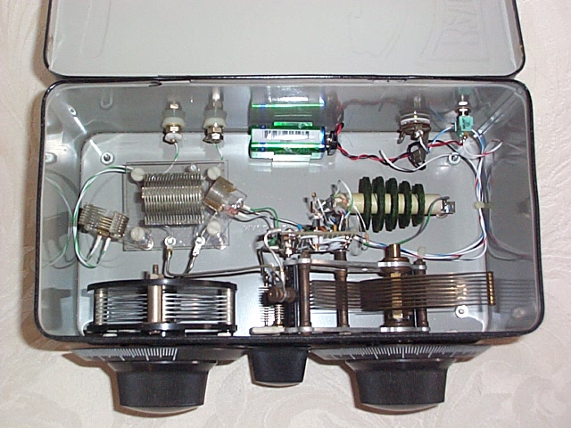 The circuit was intended as a sort of test bed, and the circuit board has jumpers on it that can reconfigure the way the output is hooked up. It can either be taken from the source circuit as in Kitchin's radios or through a transformer in the drain circuit as was usual in the old days. The throttle capacitor is a Hammarlund unit that I bought at Henry Radio in Anaheim when I was about 13. It was intended to be used in a regenerative receiver from the 1958 ARRL Handbook that I never built.